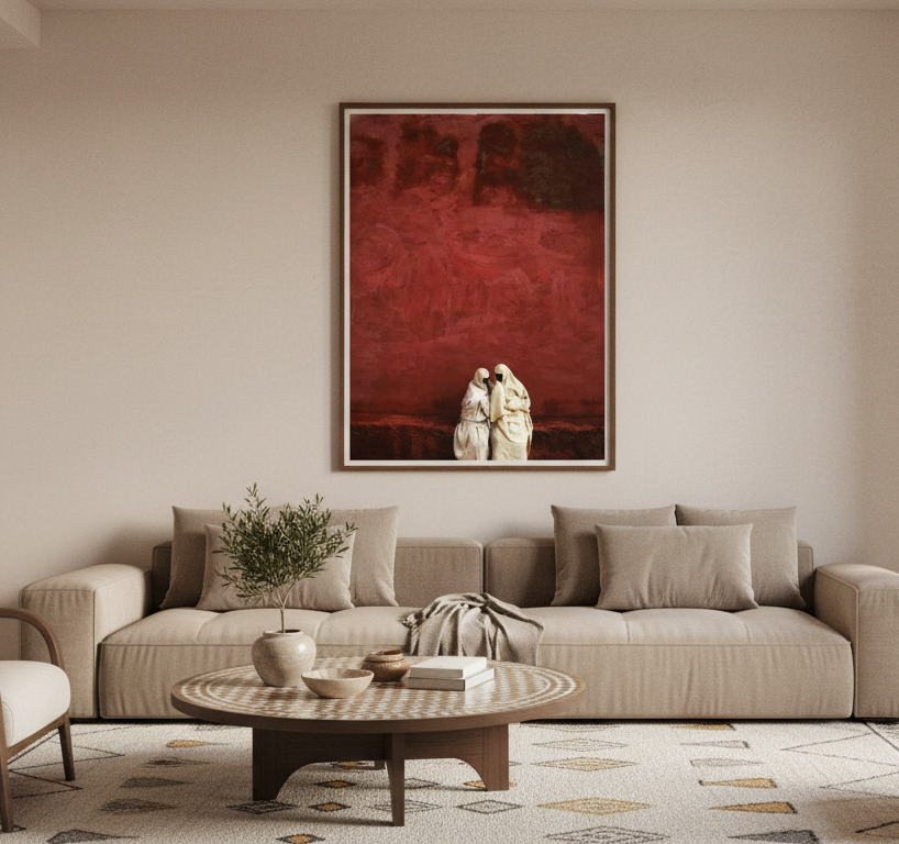 لوحة مستوحاة من الذاكرة المغربية، بألوان دافئة ولمسة إنسانية كتعبّر على الأصالة والهدوء، جاهزة للتعليق وكتعطي قيمة خاصة لدارك.